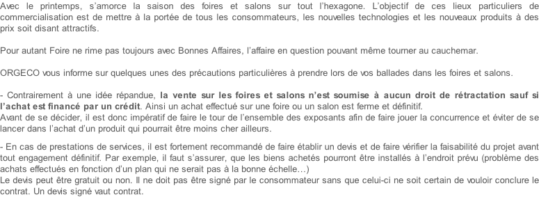 L’ambiance des foires et salons est favorable aux achats. On parle de prix « spécial salon », de promotions exceptionnelles, etc. Jusqu’au bagout des vendeurs sur les stands pour faire naître la fièvre acheteuse ! Mais avant d’acheter, il importe de bien réfléchir car une fois la transaction conclue, le consommateur ne peut plus revenir sur sa décision. En effet, tout achat effectué sur une foire, un salon ou un marché ne bénéficie PAS d’un délai de rétractation.